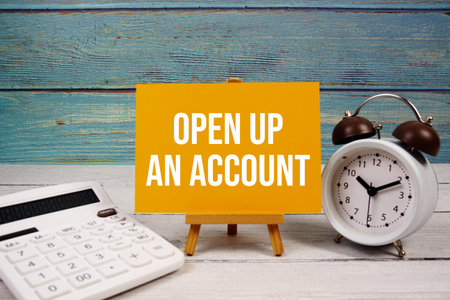 Open Up An Account text written on paper card with calculator and alarm clock on wooden background