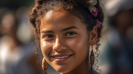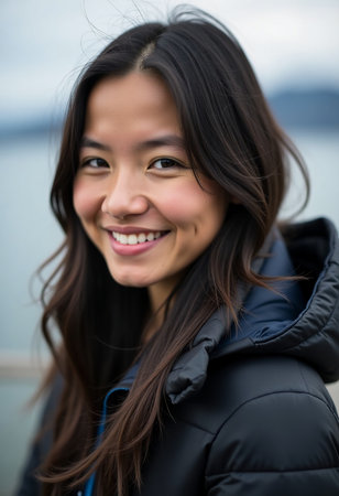 In a serene Alaskan setting, a young Alaska Native woman radiates happiness as she smiles gracefully, surrounded by natures beauty and calm waters.