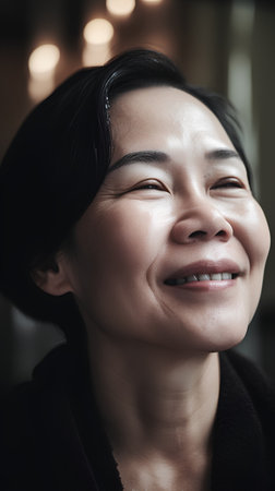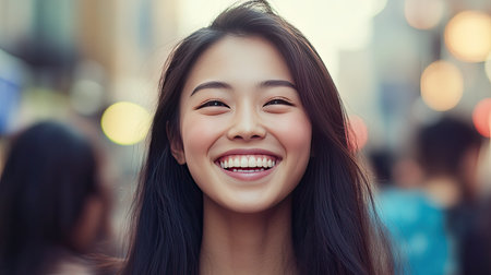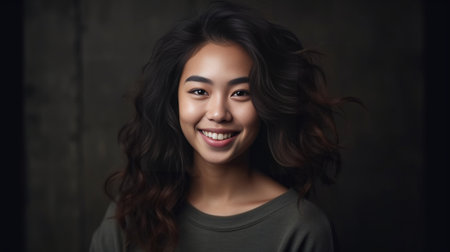 Generative AI : Headshot of young happy attractive asian with trendy curly brunette hair stylish female designer or influencer smiling and looking at camera with confident and posi