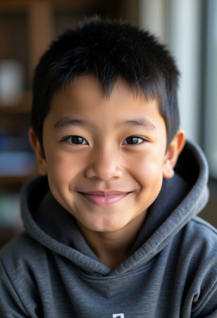 A joyful young boy of Alaska Native descent beams with pride in a soft gray hoodie. His bright smile captures the spirit of his community and culture.