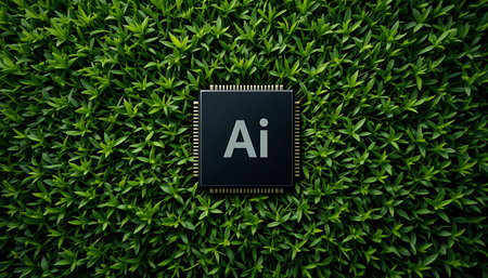 Black Ai chip on green grass background. cpu. AI Technology in Nature. AI Environment. artificial intelligence chip, Hardware, machine learning. advanced computing technology. digital innovation