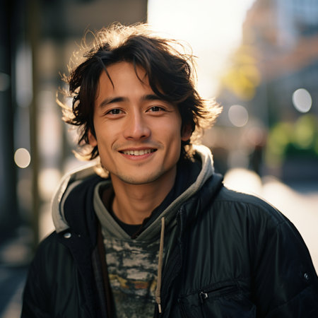 A young man 25 years old with a bright smile stands outdoors, surrounded by lively activity. A resident of Kazakhstan, cute man of 25 years old. A grown man, confident in his abilities. AI generated.