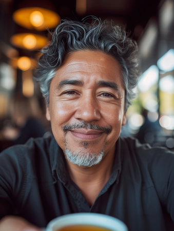 Hispanic man with gray hair in a cozy cafe, he holds cup of coffee