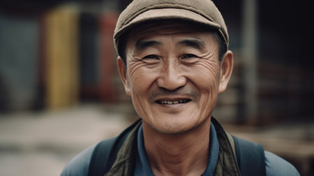 A smiling senior Chinese male construction worker standing in construction site. Generative AI AIG19.