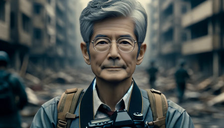 A man with glasses and a backpack is standing in front of a building. He is holding a camera and he is a photographer. The image has a mood of adventure and exploration