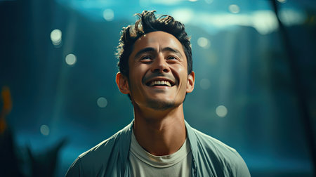 Smiling young handsome southeast Asian man clapping hands impressively in background. Man portrait illustration. Generative AI art