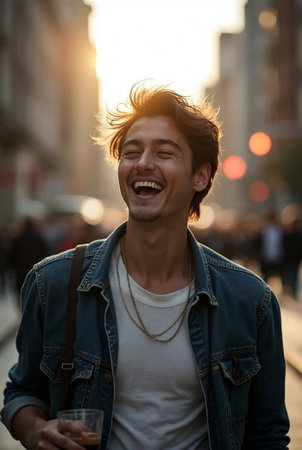 A young man with a confident expression poses against a backdrop of a cityscape and urban setting. Resident of Kazakhstan, a cute man of 25 years old. Student, entrepreneur or applicant. AI generated.
