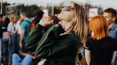 Young beautiful woman dancing at the music festival