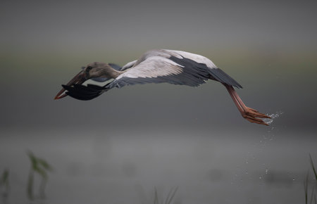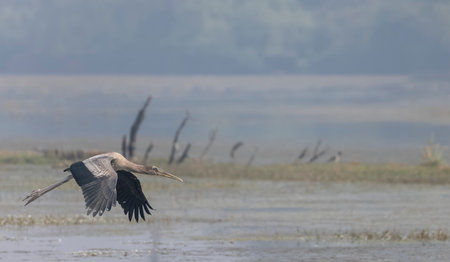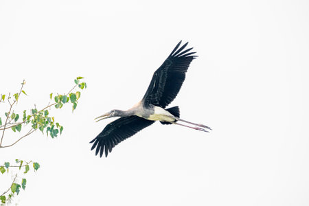 Painted Stork (Mycteria leucocephala) bird in action during winter migration.