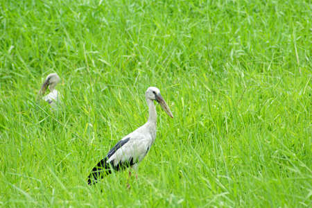 Beautiful white stork (Ciconia ciconia) hunting in rice field. Asian Openbill, Open-billed stork, Anastomus oscitans (Ciconiidae)forage in rice paddies field in wetlands that extend near urban areas.