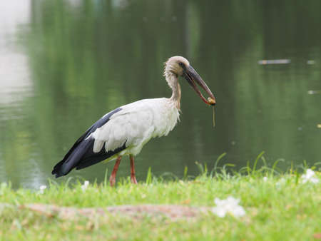 Painted Stork is flying over the pond. To feed on the herd in shallow waters along rivers or lakes