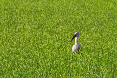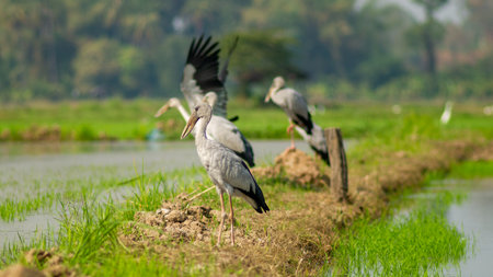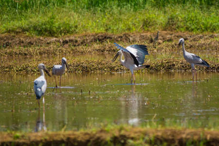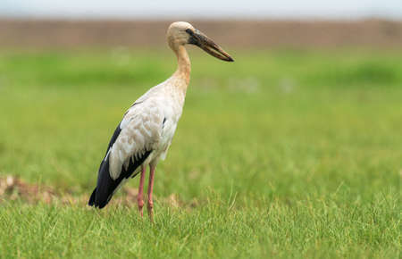 The Asian openbill (Mycteria leucocephala) in the rice field.