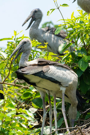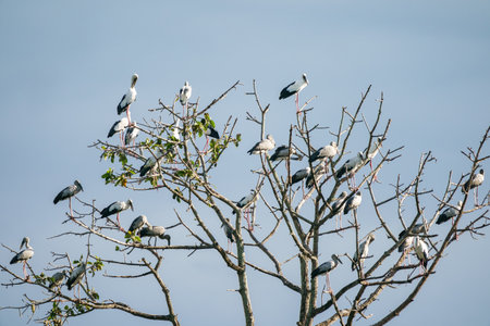 Flock of Open-billed stork, or Asian openbill birds on tree in the public park. The Asian openbill or Asian openbill stork (Anastomus oscitans) is a large wading bird in the stork family Ciconiidae.