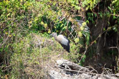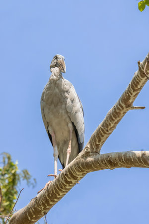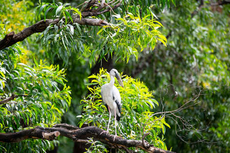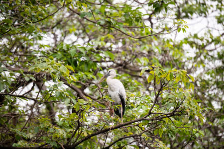 Asian Openbill bird stand on tree. (Anastomus oscitans)