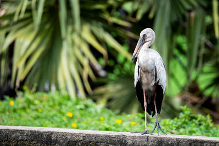 An Asian openbill is standing on one leg and making scratching by the other leg.