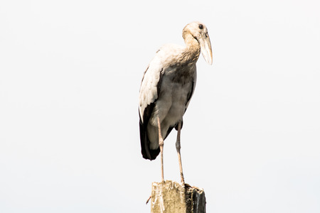 Asian openbill stork bird perched on a tree, isolated on white background with copy space