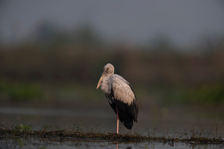 A Woolly Necked Stork standing in the tall grasses in the early morning light in the Chitwan national Park in Nepal.