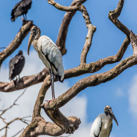 A flock of open billed stork bird perch and winged at the tree on blue sky and white cloud background. A lot of black and white color of Asian openbill bird on the green tree.