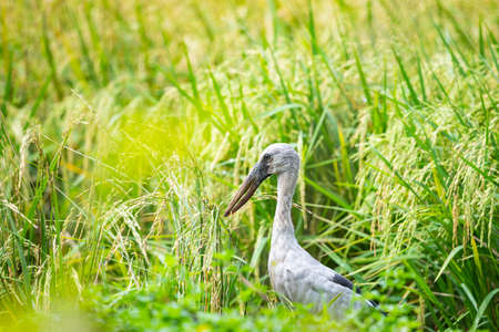 A Woolly Necked Stork standing in the tall grasses in the early morning light in the Chitwan national Park in Nepal.