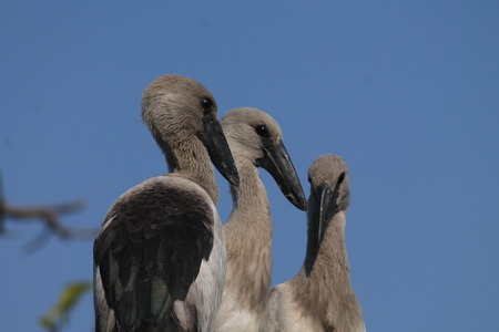 Flock of Open-billed stork, or Asian openbill birds on tree in the public park. The Asian openbill or Asian openbill stork (Anastomus oscitans) is a large wading bird in the stork family Ciconiidae.