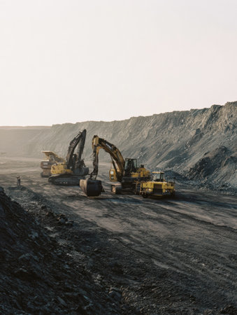 Heavy Machinery Drives Through Dusty Quarry at Sunset Creating a Dramatic Landscape of Earth and Shadows. Generative AI