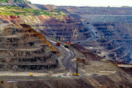 open cast mine extracting iron ore with heavy trucks, excavators, diggers and locomotives