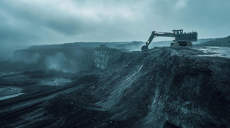 Heavy machinery works at a coal mining location, surrounded by piles of material and enveloped in fog, creating an atmospheric feel of the operation.