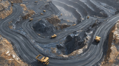 Open surface mining scene with multiple hauling paths and deep black coal layer