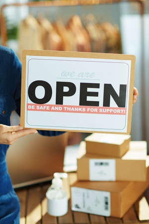 Small business owner smiling and holding the sign for the reopening of the place after the quarantine due to covid-19.