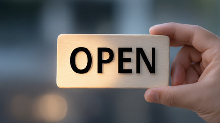 A person holds a wooden sign that reads OPEN, symbolizing accessibility and customer engagement in a bright, inviting environment. Perfect for business themes.