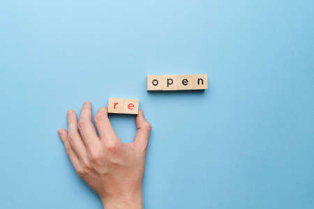 Hand flipping reopen wording parting screen on wooden cubes block among illustration shop. Shopping mall and restaurants open again after COVID 19.