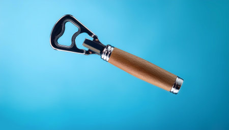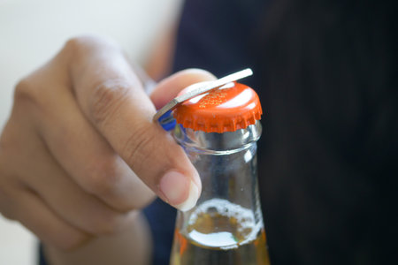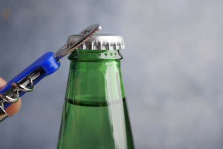 Close up of a man holding a bottle of craft beer using an opener, on wooden background