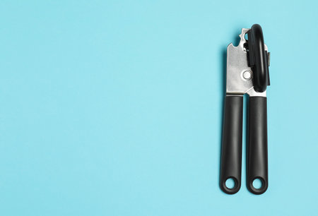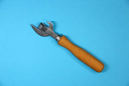 Closed can and can opener. Canned food and a special knife. Long-term storage products. Close-up. Copy space.