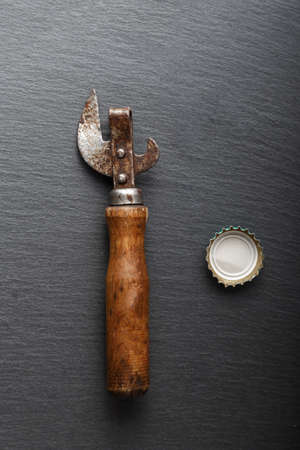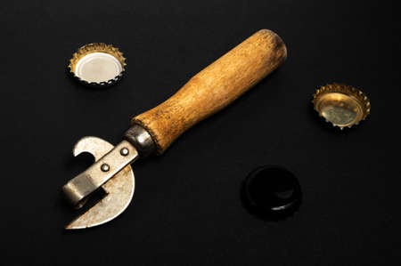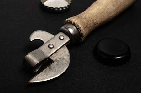Fragment of the vintage multipurpose bottle opener and bottle opener in the form of a keychain among of different used bottle caps on the rustic table close-up at selective focus