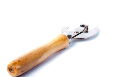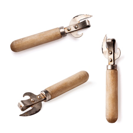 Man's hands open a tin can with an old can opener with a wooden handle. Canned food and a special knife. Adult male of European race.