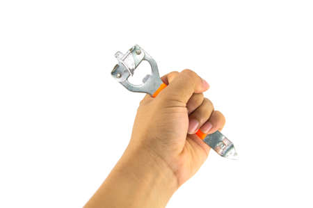 Man's hand holds a can key. Shiny metal special key. Adult Male of European Race Demonstrates Kitchen Accessories