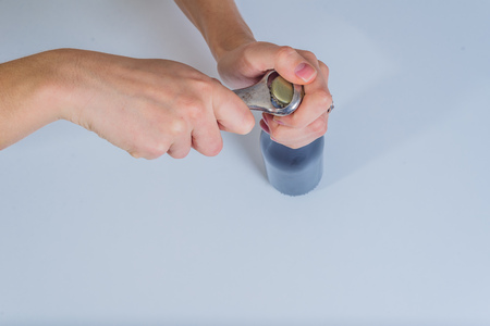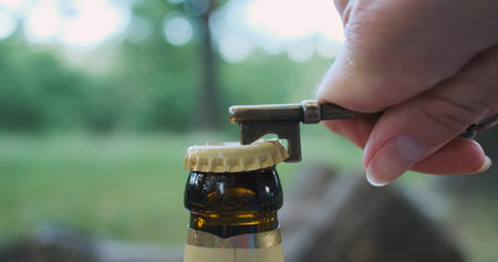 female hand opens bottle of beer. Close-up, the neck of bottle in nature with green foliage. Not on the first try.