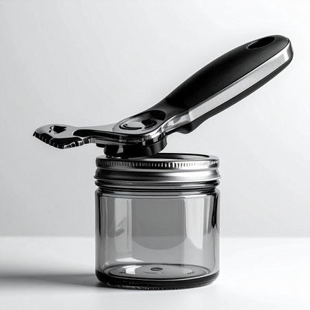 A sleek, modern can opener is poised atop a simple glass jar in this minimalist black and white studio photograph.