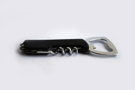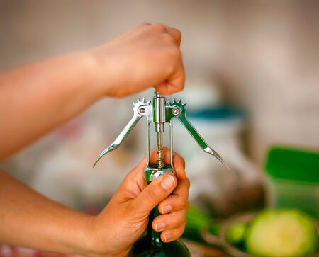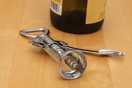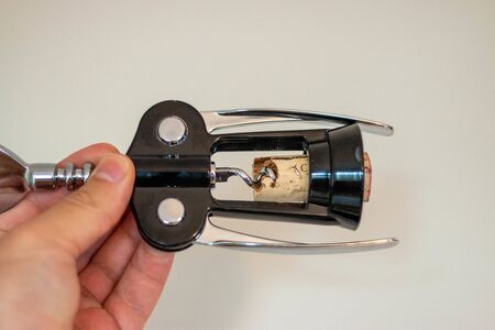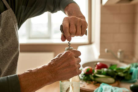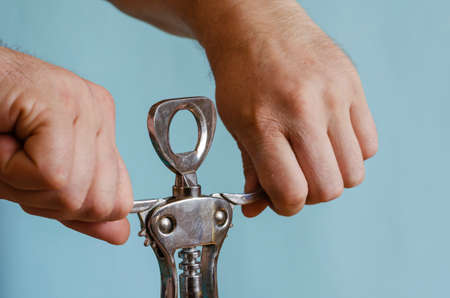 Adult man holds in his hands the metal handle of a corkscrew. The process of uncorking a wine bottle. Male of European race, 43-45 years old. Kitchen utensils