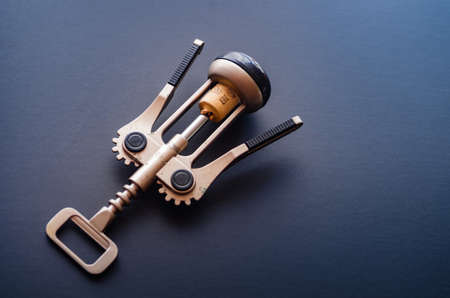 Traditional corkscrew with metallic arms on cork stopper collection Tool used to uncork wine, alcohol