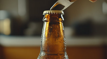 A close-up view of a hand using a bottle opener to uncap a cold glass soda bottle glistening with condensation in a cozy kitchen setting.