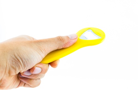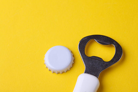 Red corkscrew or metal bottle opener on a yellow surface. Copyspace.