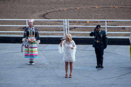 Moscow, Russia - April 23, 2018: Famous Russian singer Polina Gagarina sings in front of participants in the business forum