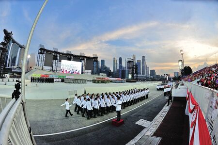 SINGAPORE - JULY 04: Guard-of-honor contingents standing at attention during Singapore National Day Parade 2009 combined rehearsal at Marina Floating Platform July 04, 2009 in Singapore.