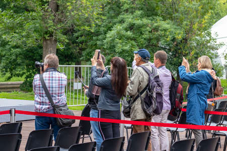 Moscow, Russia - August02, 2019: Group of photographers taking picture together on an open air festival.