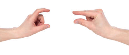 Male hand measuring or holding invisible item, mans palm making gesture while showing small amount of something on black isolated background