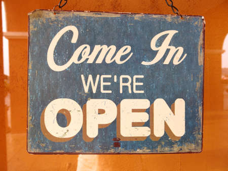 Vintage open sign board word 'Come in We're Open' through the glass of window on Cafe at restaurant open door
