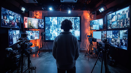 A dark room with a row of monitors and a large screen. Generative AI