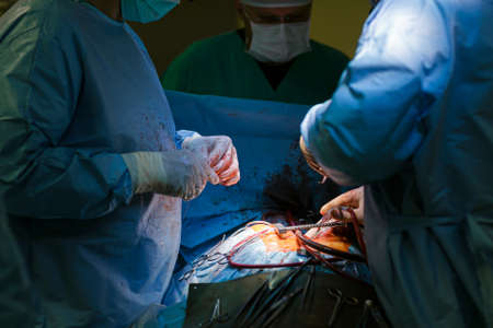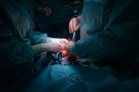 Closeup of professional doctor hands operating a patient during open heart surgery in surgical room. Healthcare and medical intervention concept