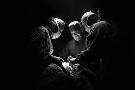A grayscale image captures medical professionals focused on a surgical procedure. The scene is illuminated by strong overhead lighting, highlighting the surgeons in their protective gear. The composition, dominated by shadow, suggests a serious and critical environment. This image could be used for medical publications or related educational materials.